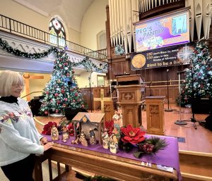 Aylmer-Malahide Museum and Archives volunteer Melanie MacNeil welcomed guests on the annual Christmas Tour of Homes to St. Paul’s United Church in Aylmer on Saturday, Nov. 15. The church was also decorated for the holidays, including trees, wreaths, laurels and, in front of the altar, a crèche. The 150-year-old church had been busy during the tour, she reported. The church was dedicated by Rev. Egerton Ryerson and can seat over 700 for a service. Basement rooms were also decorated for the holiday season and to show programs offered by the church. (AE/Rob Perry)