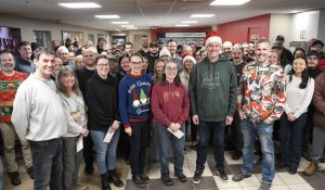 Richard and Karen Auckland of St. Thomas Christmas Care, left, Laura Bos of Victorian Order of Nurses Student Nutrition Program and Penny Hilliker and Marcie Tenk of East Elgin Community Assistance Program’s Christmas Care program received on behalf of each organization a $25,959 donation, for a total of $77,878, from Co-Presidents Bryan White and Jason White and the employees of Steelway Building Systems at Springwater on Tuesday, Dec. 16. For full details, see the Dec. 24 edition of The Aylmer Express. (AE/Rob Perry)