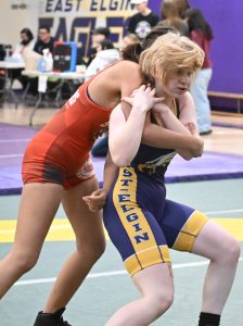 Peyton Thiessen of East Elgin Secondary School set up for an arm throw on her opponent during a wrestling meet at EESS on Wednesday, Jan. 14. She placed first in her group of four wrestlers. More pictures are in the Jan. 21 edition of The Aylmer Express. (AE/Rob Perry)
