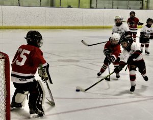 The competition was intense but fun loving at the Jason Geerts Memorial U7 Jamboree on Jan. 31, at the East Elgin Community Complex, in Aylmer. The Jamboree is named in honour of Jason Geerts, who died in 2019 at the age of 35 years after struggling with amyotrophic lateral sclerosis (ALS), or Lou Gehrig’s disease, a progressive, fatal neurodegenerative disease. Jason was a coach within the Aylmer Minor Hockey Program and also played Junior C with the Aylmer Spitfires for several years. His two sons were active in the Aylmer Minor Hockey Program and still play hockey in and around Aylmer. Both were refereeing during the Jamboree. Here, Dorchester White and Point Edward exchanged more goals than could be counted by fans. (AE/ Joe Konecny)