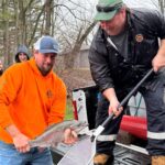 Evan Firby, representing event sponsor Zap’s Tree Service of Aylmer, holds one of three tagged trout being transferred by Conservation Areas Supervisor Al Bradford into garbage bins full of water, to be released into Springwater Pond on Thursday, April 16. Catfish Creek Conservation Authority is preparing for its annual Trout Derby, starting Saturday, April 25,…
